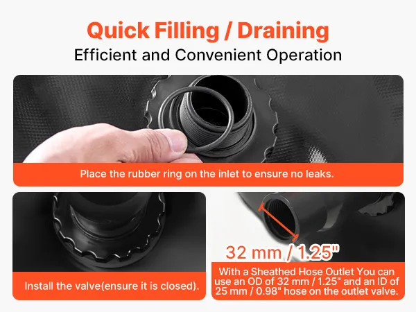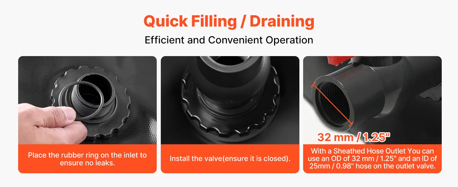 Efficient Water Storage: This collapsible portable water tank features large inlet and outlet ports -with an inlet diameter of OD 38mm/1.5" and ID 32mm, and an outlet diameter of OD 32mm/1.25" and ID 25mm, easily connected to hose for quick water storage