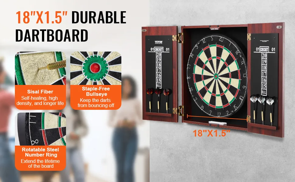 18" Diameter Dartboard: Equipped with an 18-inch diameter dartboard made from self-healing sisal fiber, this dartboard and cabinet set is designed for durability and extended use. The high-density material and staple-free bullseye prevent darts from bouncing off, while the rotatable steel number ring helps prolong the board's lifespan.