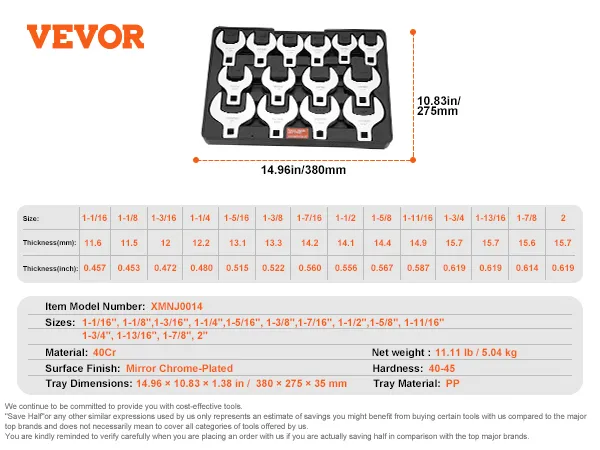 What's a good tool for any situation? The VEVOR crowfoot wrench set comes in 14 sizes from 1-1/16" to 2". This variety ensures you can handle any fastening task. Use these wrenches for mechanical maintenance or repairs, and they are perfect when working on hydraulic fittings. You should use them for electric motor bases. No matter what the job is, these tools have you covered. The 1/2-drive design makes them compatible with various tools. They work well in tight spaces and hard-to-reach areas. These wrenches provide precise fastening and disassembly. It’s an essential addition to any toolkit. This set simplifies your tasks and improves efficiency.