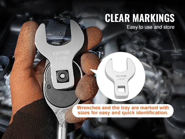 Easy Identification and Organization: Each wrench size is laser-etched onto each individual wrench for quick identification. Our crows feet wrench set comes with a sturdy PP tray with size labels, making transportation, secure storage, and quick organization hassle-free.